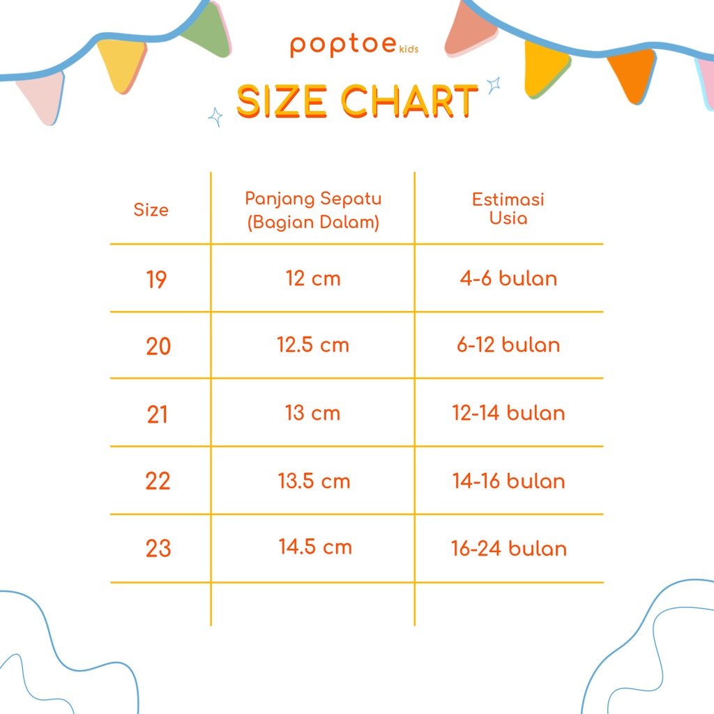 * Untuk kenyamanan dan ukuran yang pas, wajib untuk menambahkan 0,5cm – 1 cm dari ukuran panjang telapak kaki si Kecil.