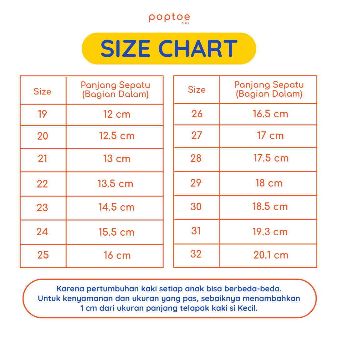 2. Disarankan menambahkan 0.5–1 cm dari panjang kaki anak demi kenyamanan optimal.